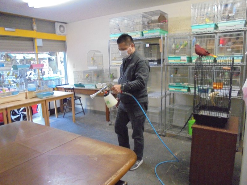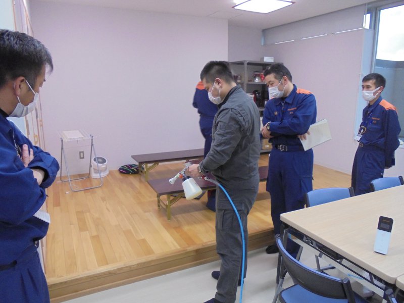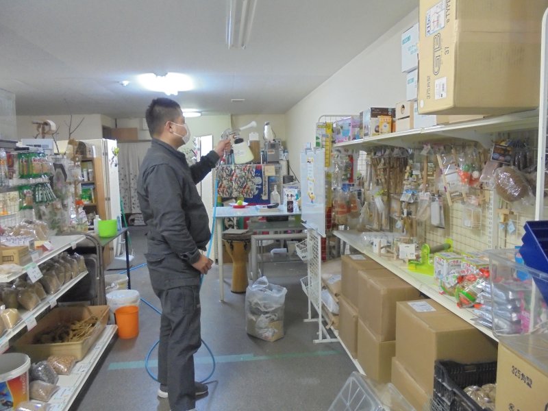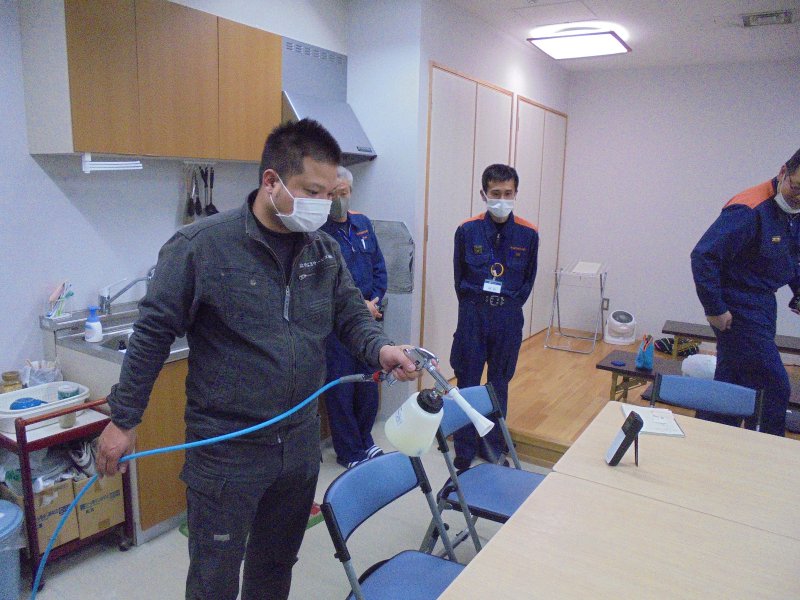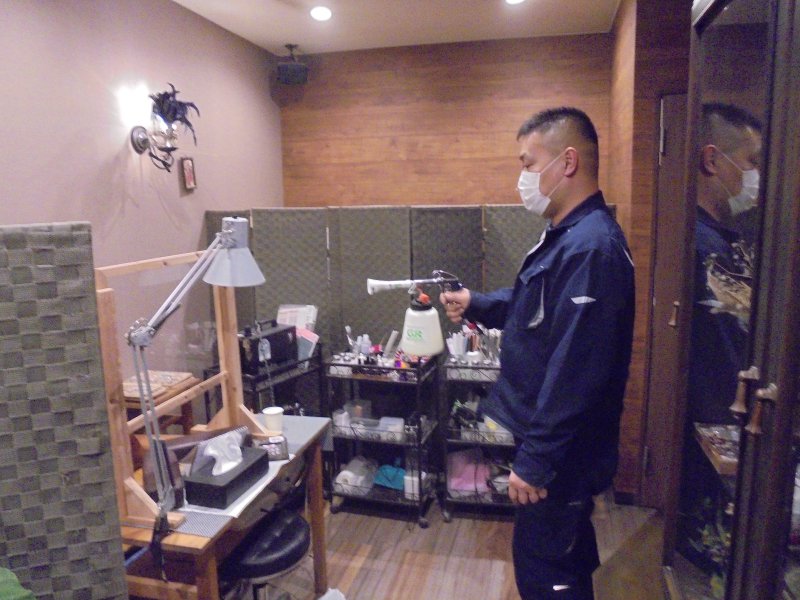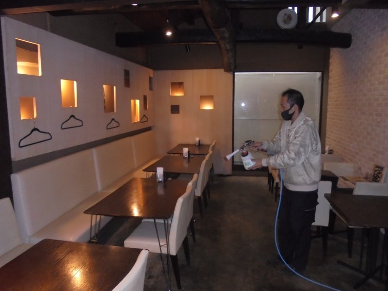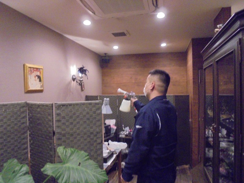 ② 床面や壁面にハイブリッド光触媒GLコートを噴きかけます。
